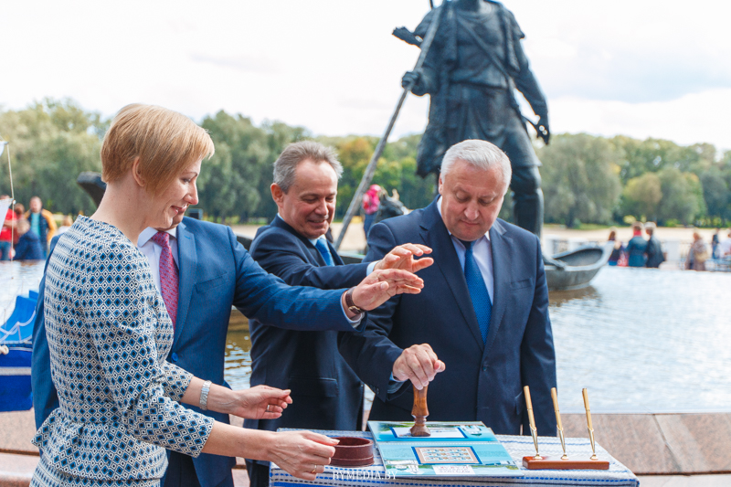 Возле скульптурной композиции, посвященной первому жителю города, первые лица города и области поучаствовали в специальном памятном гашении марки к 875-летию Гомеля.