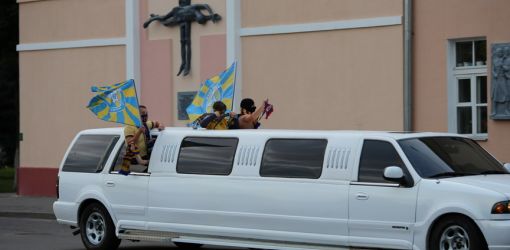 Фанаты «БАТЭ» прибыли к стадиону с опозданием, зато на лимузине и нескольких автобусах. Они высовывались в окна и люки в балаклавах или просто прикрывая лица шарфами, размахивали флагами, выкрикивали в сторону прохожих что-то, к счастью, не совсем разборчивое, но по тону очень обидное. В общем, болельщики обеих сторон в этот вечер показали, кто на что горазд. «Давай до свидания!», пара-тройка намеков на особенности личности тренера «Гомеля» от борисовчан, уже ставшее привычным утверждение, что судья – «ананас», от гомельского стадиона, и прочие радости футбола.
